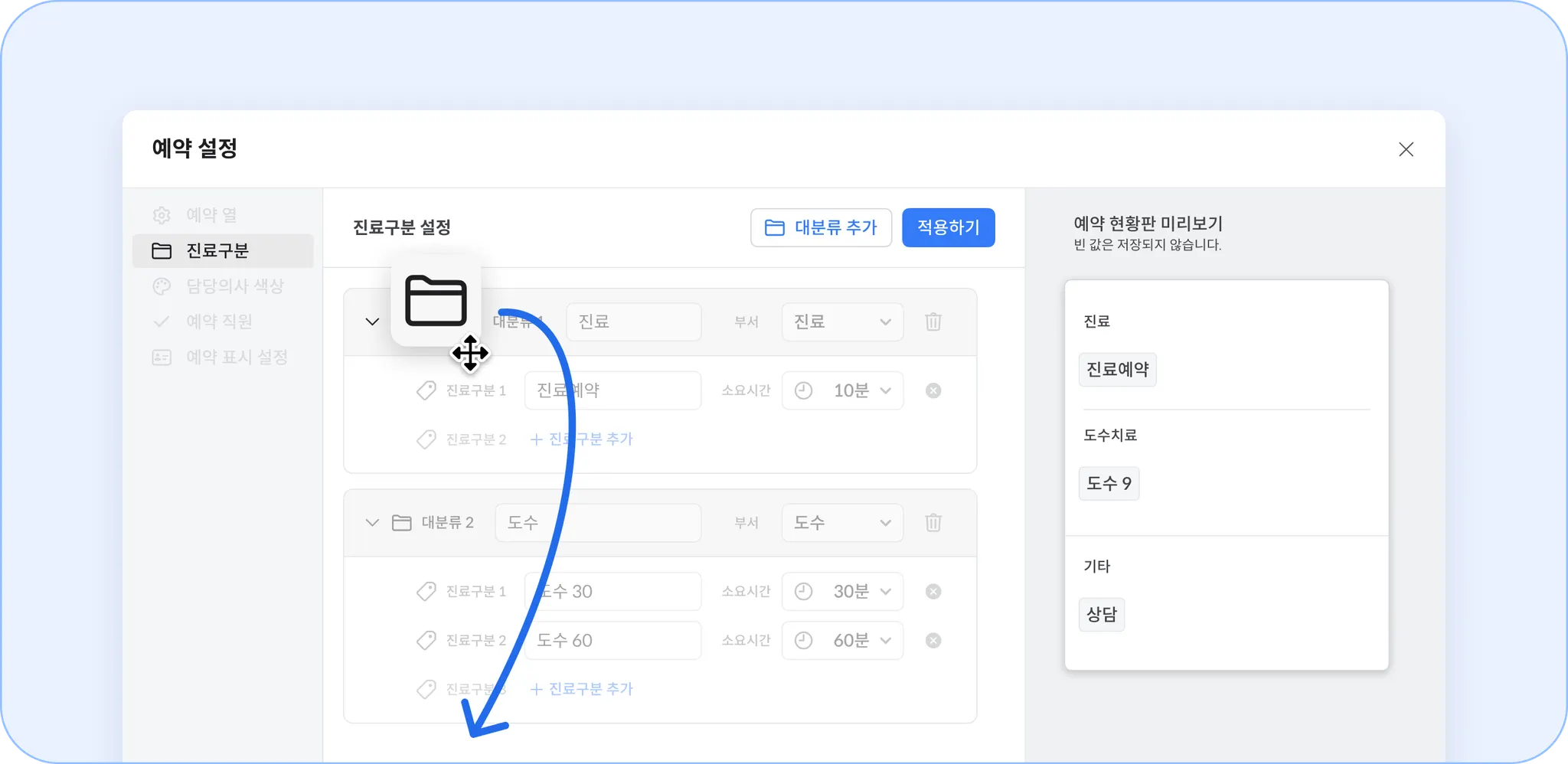 드래그를 통해 진료 구분의 대분류를 바꾸거나, 순서를 수정해보세요.