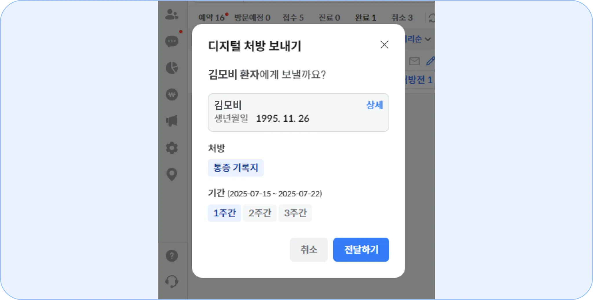 1주, 2주, 3주의 기간을 선택해서 전달하면 환자가 자신을 상태를 기록할 수 있어요.