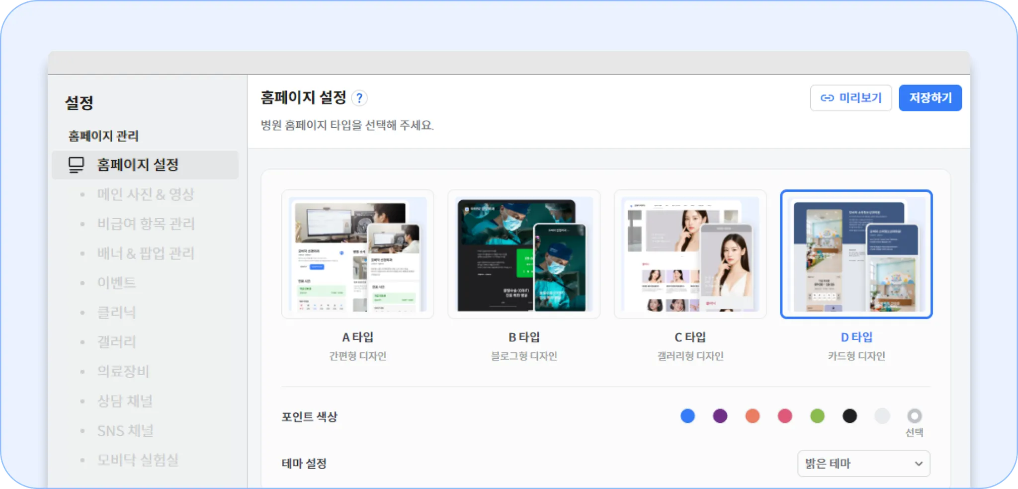 위치 : 메인화면 좌측 - 설정 - 홈페이지 설정