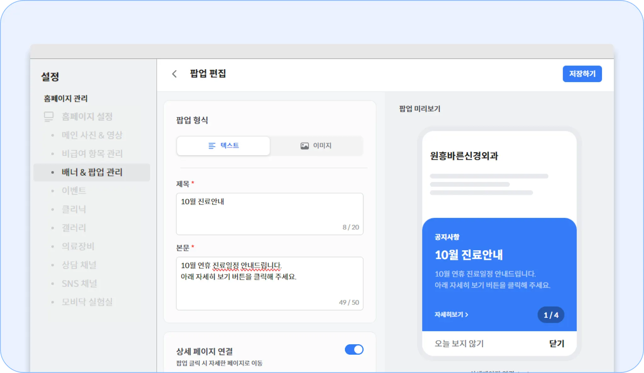 위치 : 메인화면 좌측 - 설정 - 배너&팝업 관리