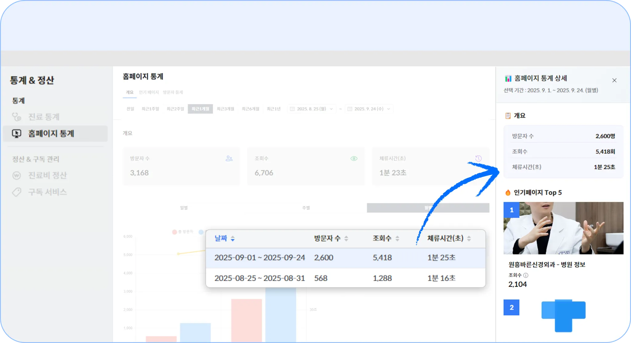 날짜를 클릭하면, 날짜 별 방문자 수, 조회수, 체류시간과 인기페이지 Top 5를 확인할 수 있어요.