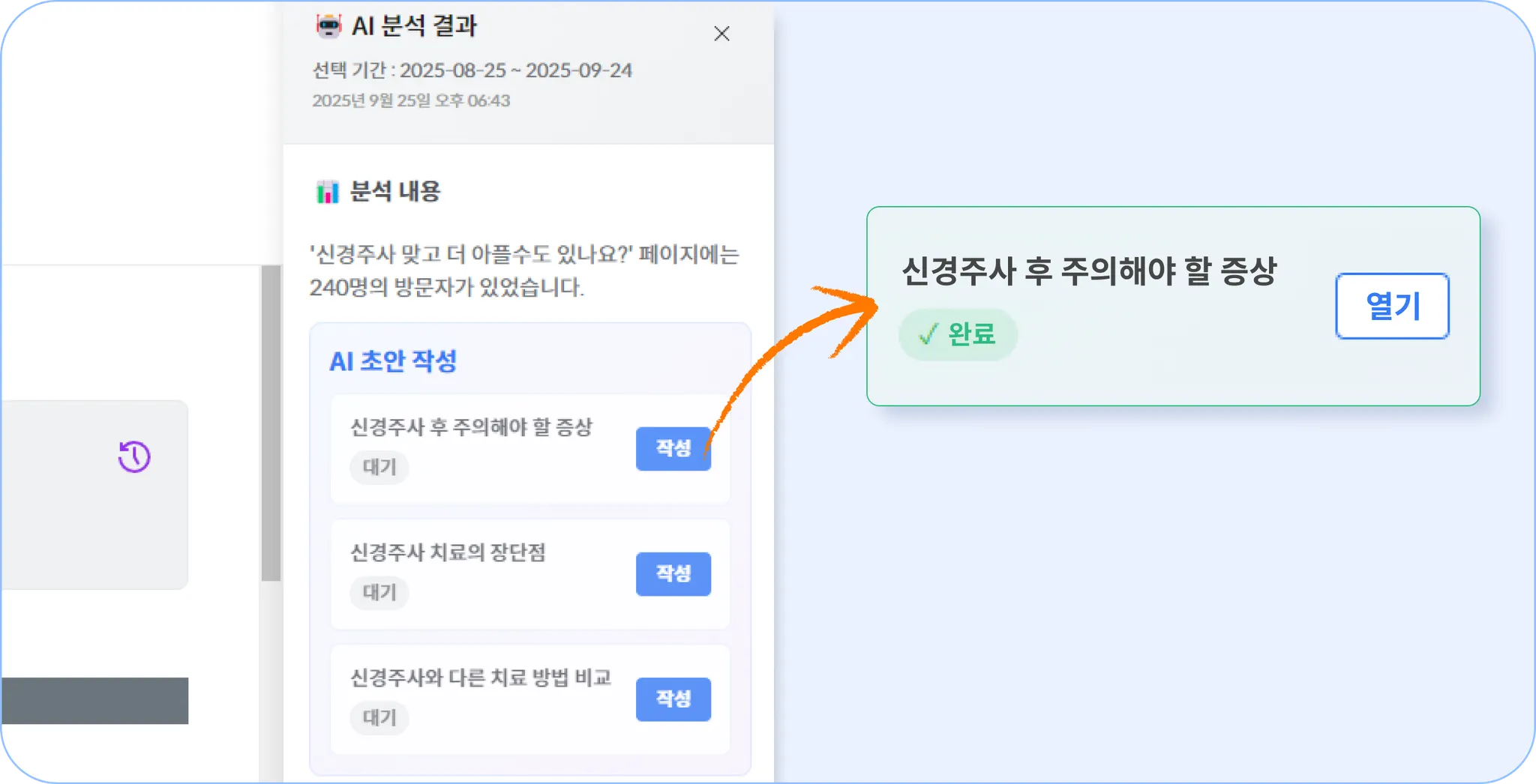 분석 시작 : 우리 병원에서 발행한 컨텐츠를 분석해서, AI가 관련 내용으로 추천 컨텐츠를 작성해줘요.