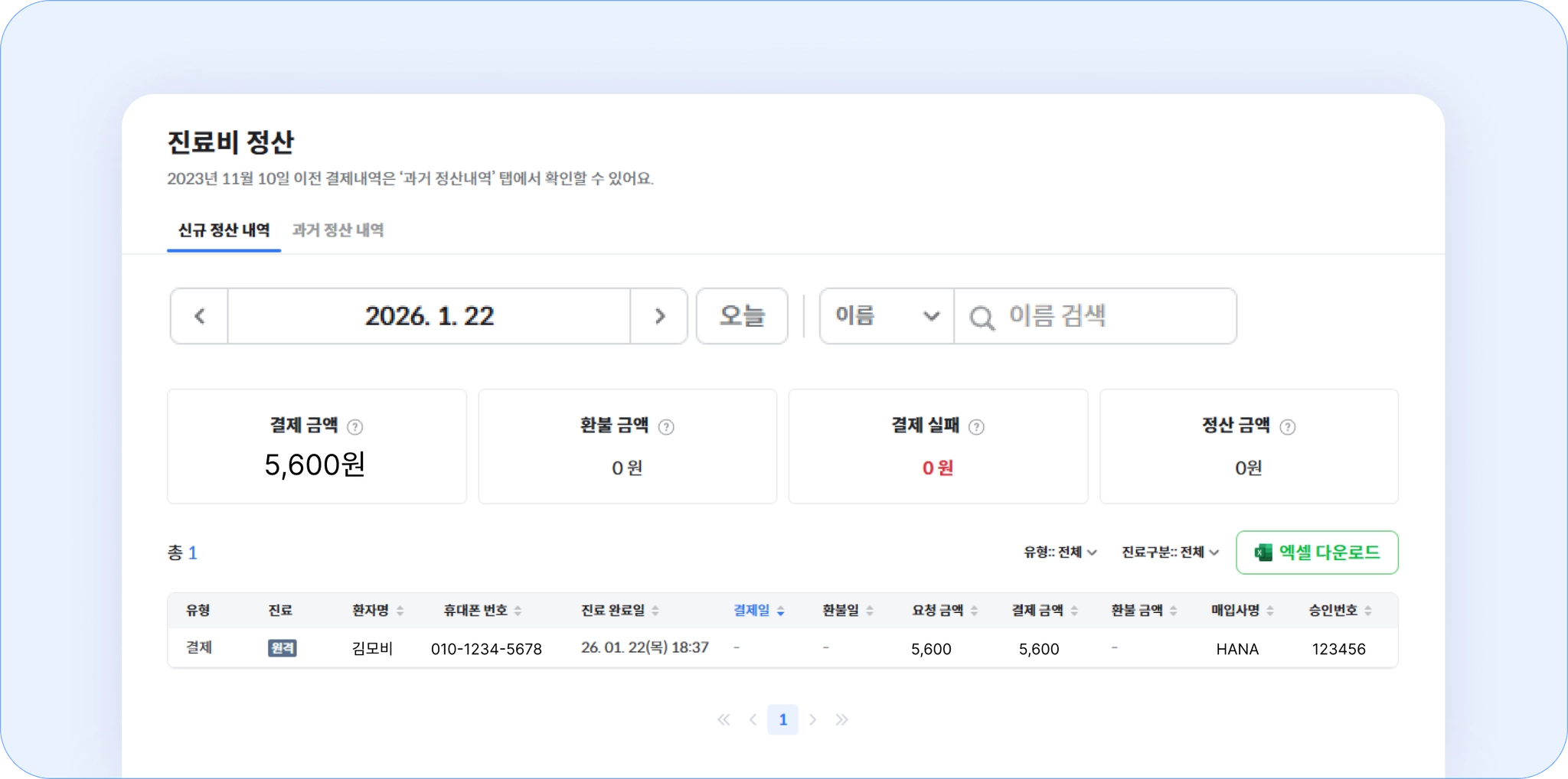특정 날짜 별 진료비 정산 금액을 확인할 수 있어요.