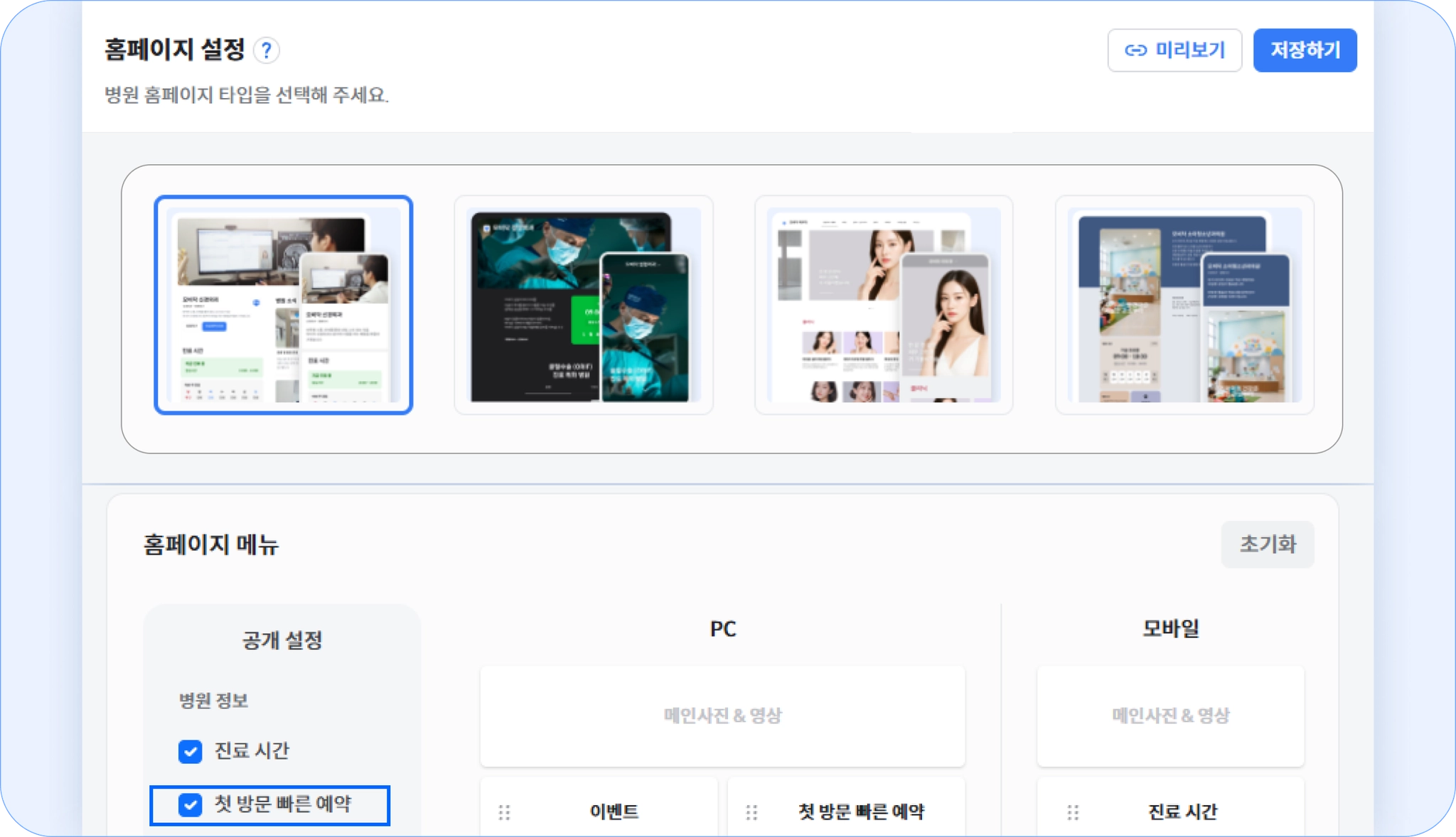 위치 : 홈페이지 설정 - 공개 설정 - 첫방문 빠른 예약 클릭