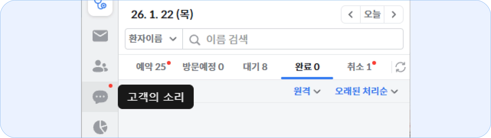 접수된 첫방문 빠른 예약은 메인화면 좌측 아이콘 열의 고객의 소리에서 확인할 수 있어요.
