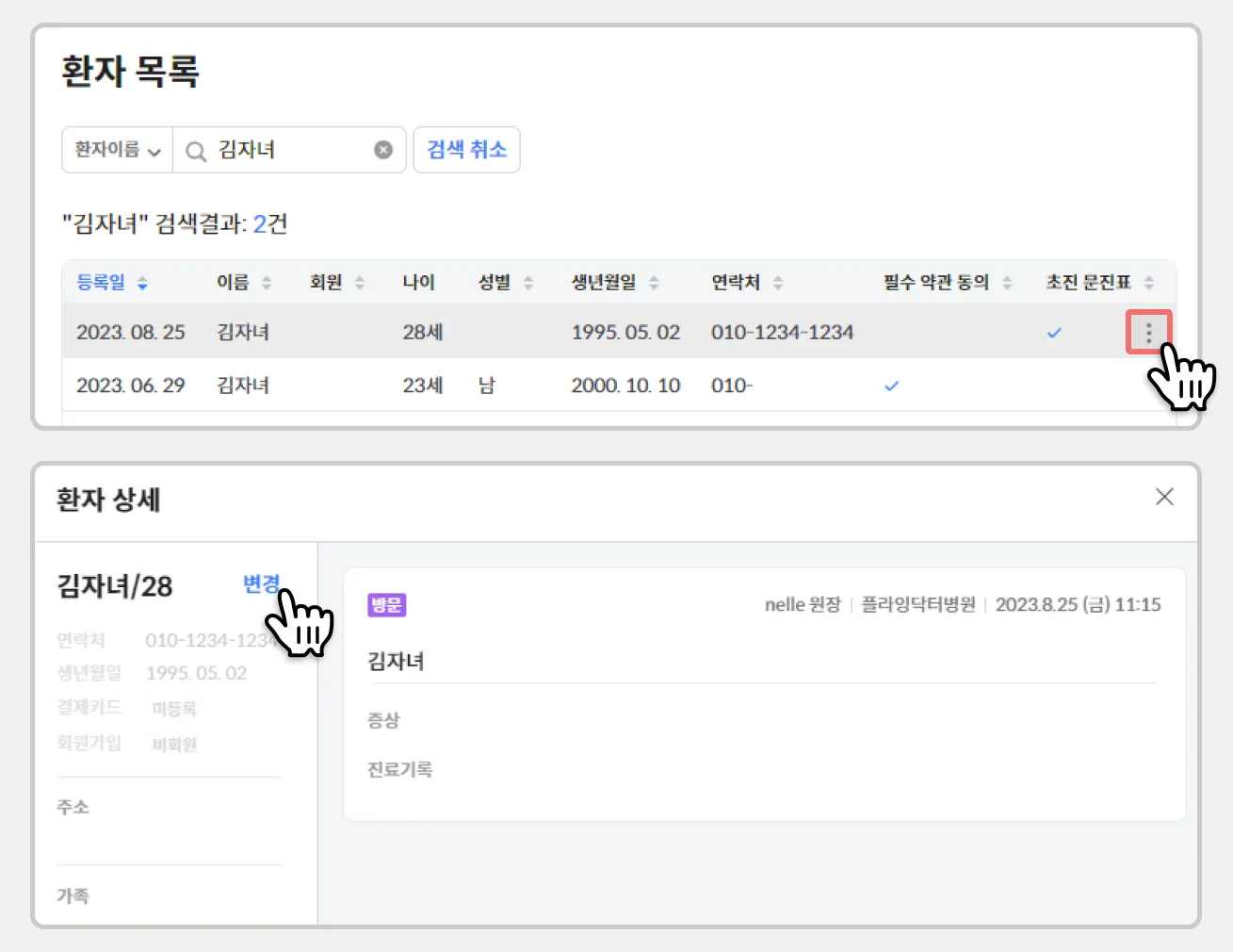 “환자 정보 우측의 ⋮ 아이콘” 또는 환자명 클릭 후 “환자 상세 화면에서 [변경] 버튼”을 클릭해 주세요.