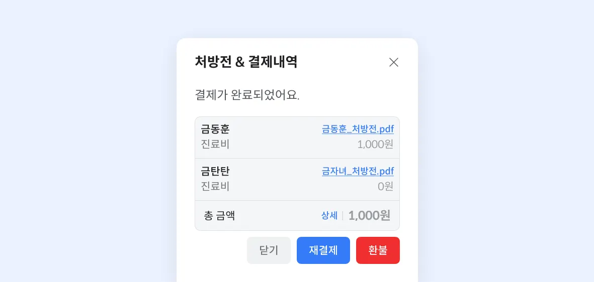 구성원 중 한명의 진료비만 결제한 경우, 환자 재결제 버튼을 클릭하여 구성원 전체의 진료비를 결제해주세요.