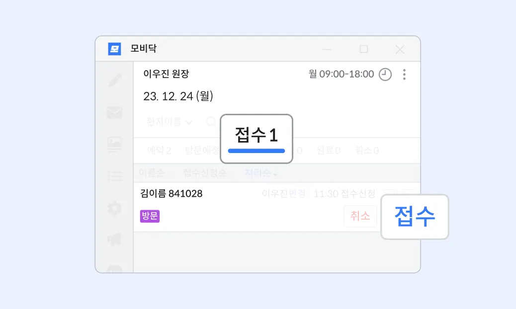 환자가 앱 또는 카메라로 QR 스캔 및 신청서를 작성하면 접수 탭에 표시 됩니다.