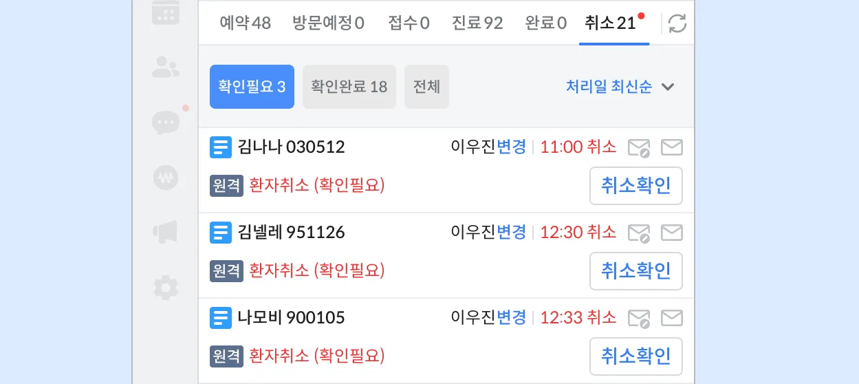 확인필요 | 환자가 취소한 예약에 대해 병원 확인이 이뤄지지 않은 건 |