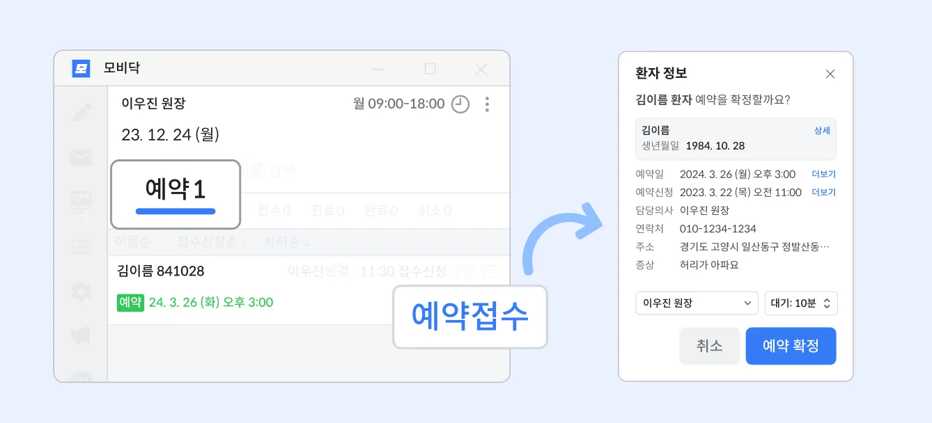 예약접수 버튼을 클릭하고 환자 정보 창에서 예약확정을 클릭해 주세요.