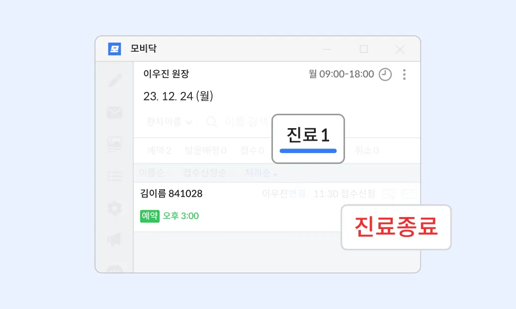 진료 및 수납을 마치면 해당 화면에서 종료 버튼을 클릭해 주세요.