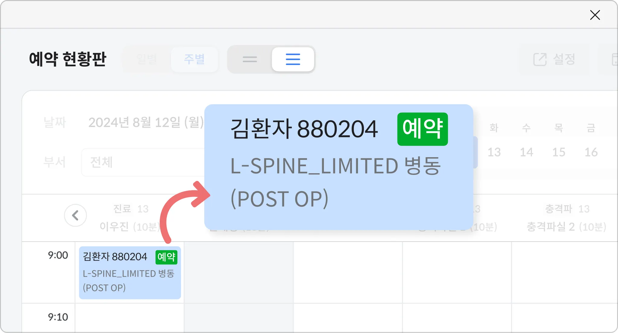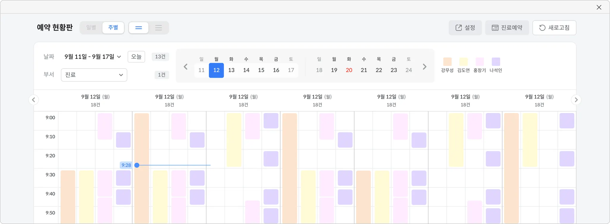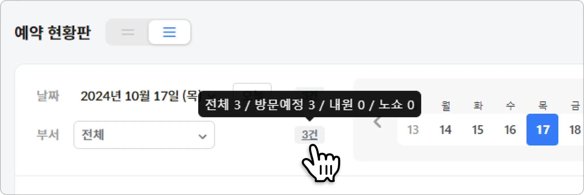 예약 현황판 좌측 상단의 ‘일별’ 또는 ‘주별’ 기준을 직접 선택해서 예약 현황을 편하게 확인하세요.
