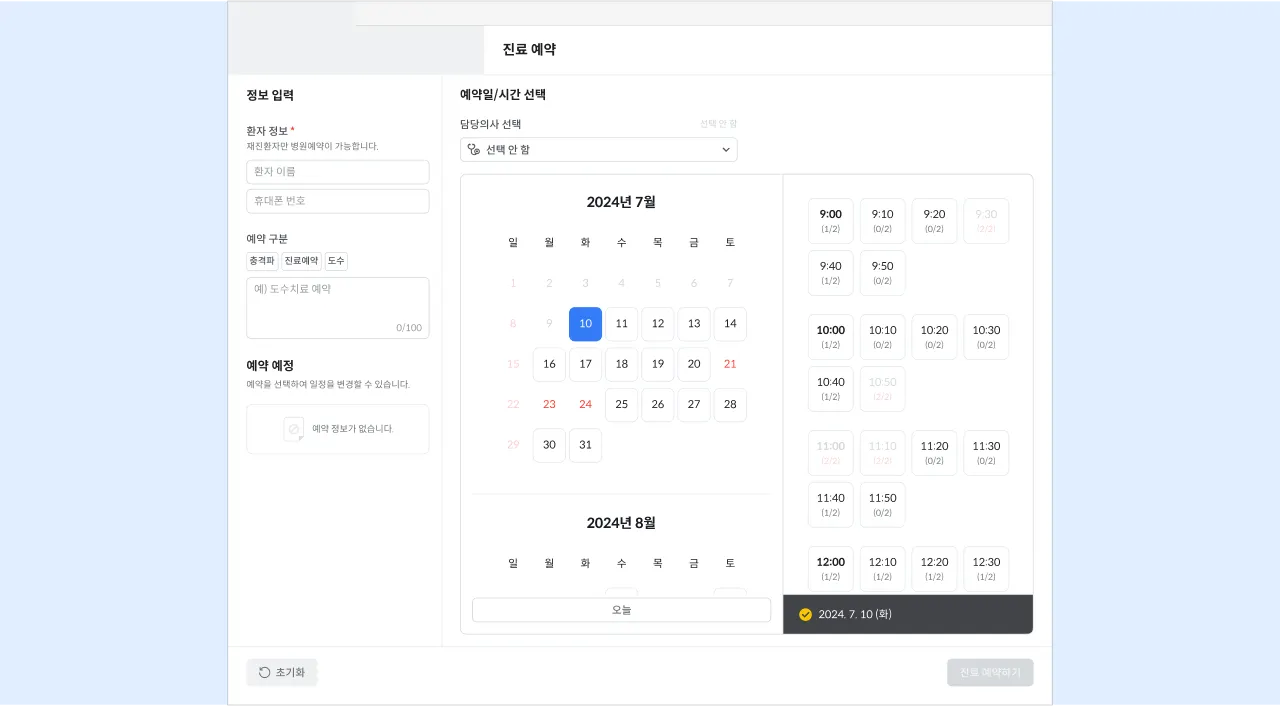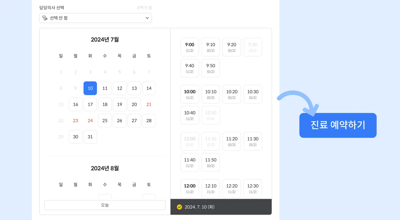 담당의사와 예약일시를 선택 후 하단 진료 예약하기 버튼을 클릭해 주세요.