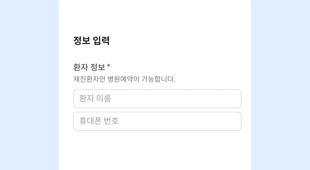 환자 정보를 조회합니다. 신규 환자는 앱 또는 병원 홈페이지(모비닥 홈페이지 구독 병원에 한해)로 예약 가능해요