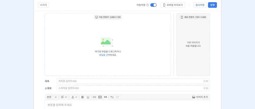 미완성 글을 보관하고 싶어요 : 우측 상단의 임시저장 버튼을 클릭하여 작성한 내용을 미발행 상태로 보관할 수 있어요.