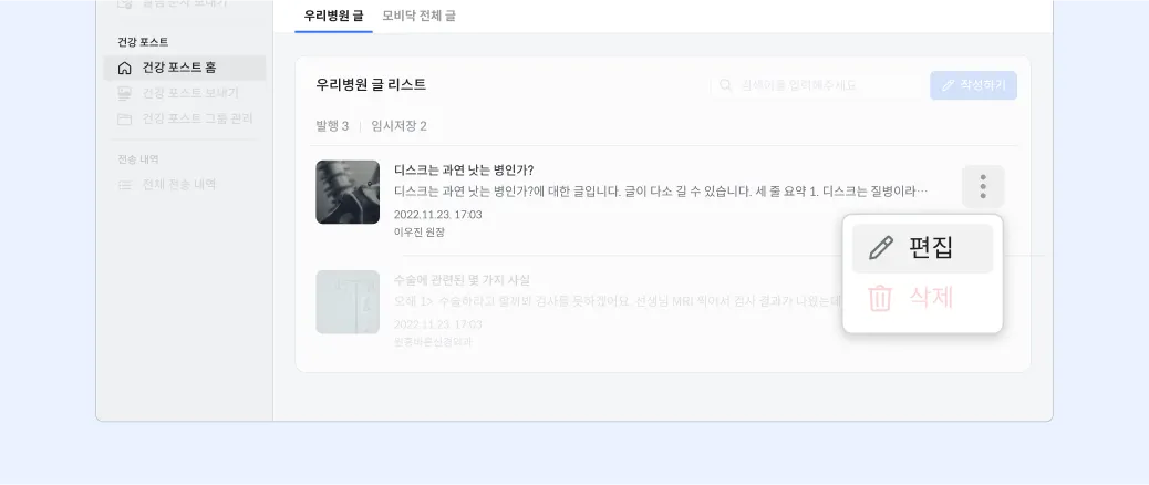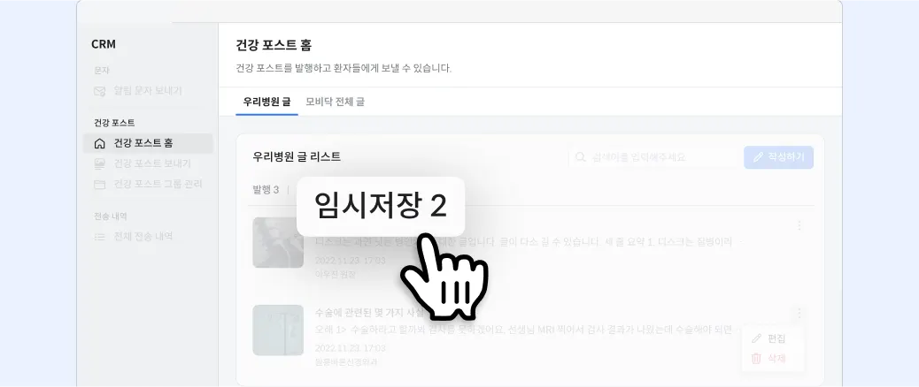 건강 포스트 홈 - 우리병원 글 - 임시저장을 순서대로 클릭합니다.