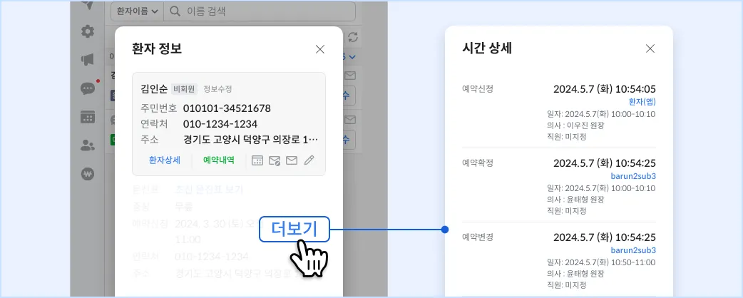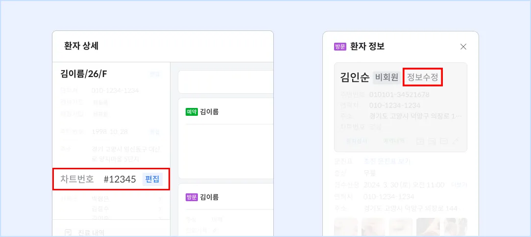 환자 상세 또는 환자 정보 창에서 차트 번호 등록 및 수정이 가능해요. 이제 진료예약 화면에서도 차트 번호로 환자를 검색할 수 있어요.
