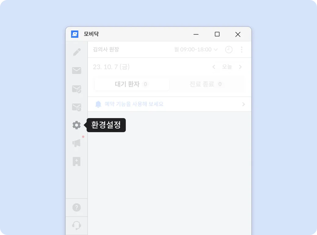 현재 계정을 로그아웃 하는 방법 : 모비닥 화면 좌측의 환경설정 버튼을 클릭해 주세요.