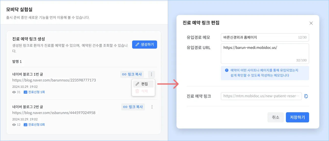 진료 예약 링크 생성 및 통계 기능이 추가됐어요