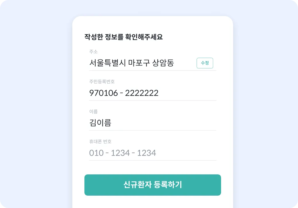 이름, 주민등록번호, 주소지를 입력하고 “신규환자 등록하기” 버튼을 클릭합니다.