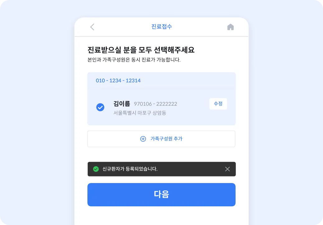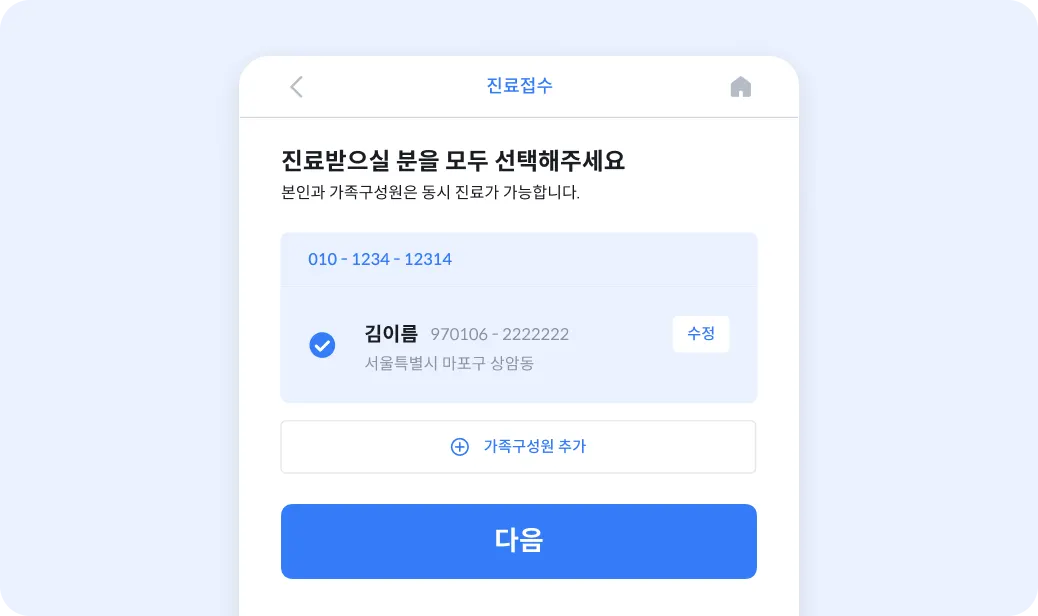 가족구성원 추가 버튼을 클릭하면 가족과 함께 진료받을 수 있어요.