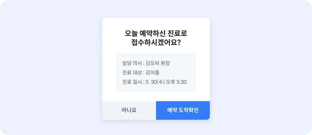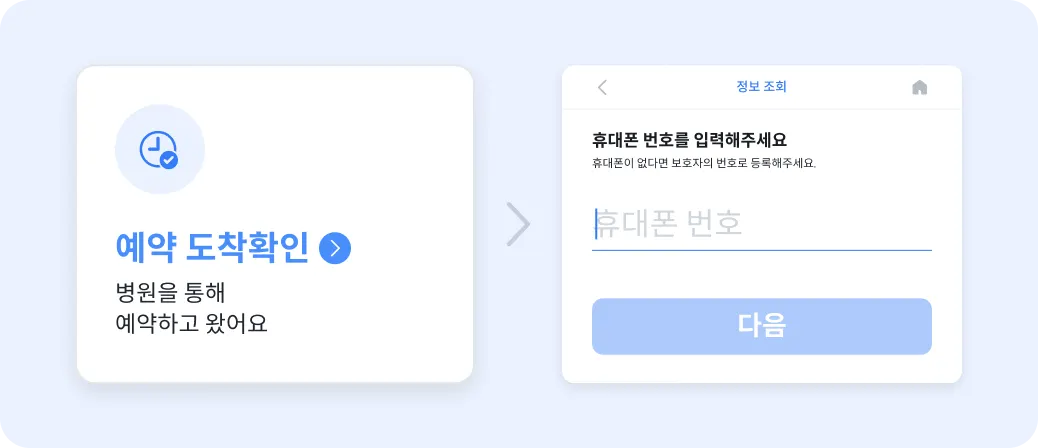 아래와 같이 접수처로 가지 않아도 내가 병원에 도착했음을 알릴 수 있어요.