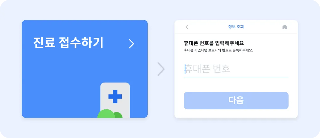 메인 화면의 “진료 접수하기”를 클릭하고 휴대폰 번호 입력 후, “다음”버튼을 클릭합니다.