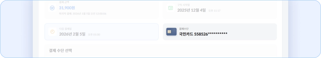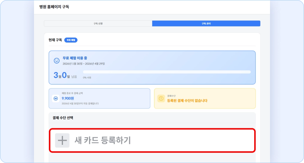 구독 관리 → 새 카드 등록하기 버튼을 클릭해 주세요.