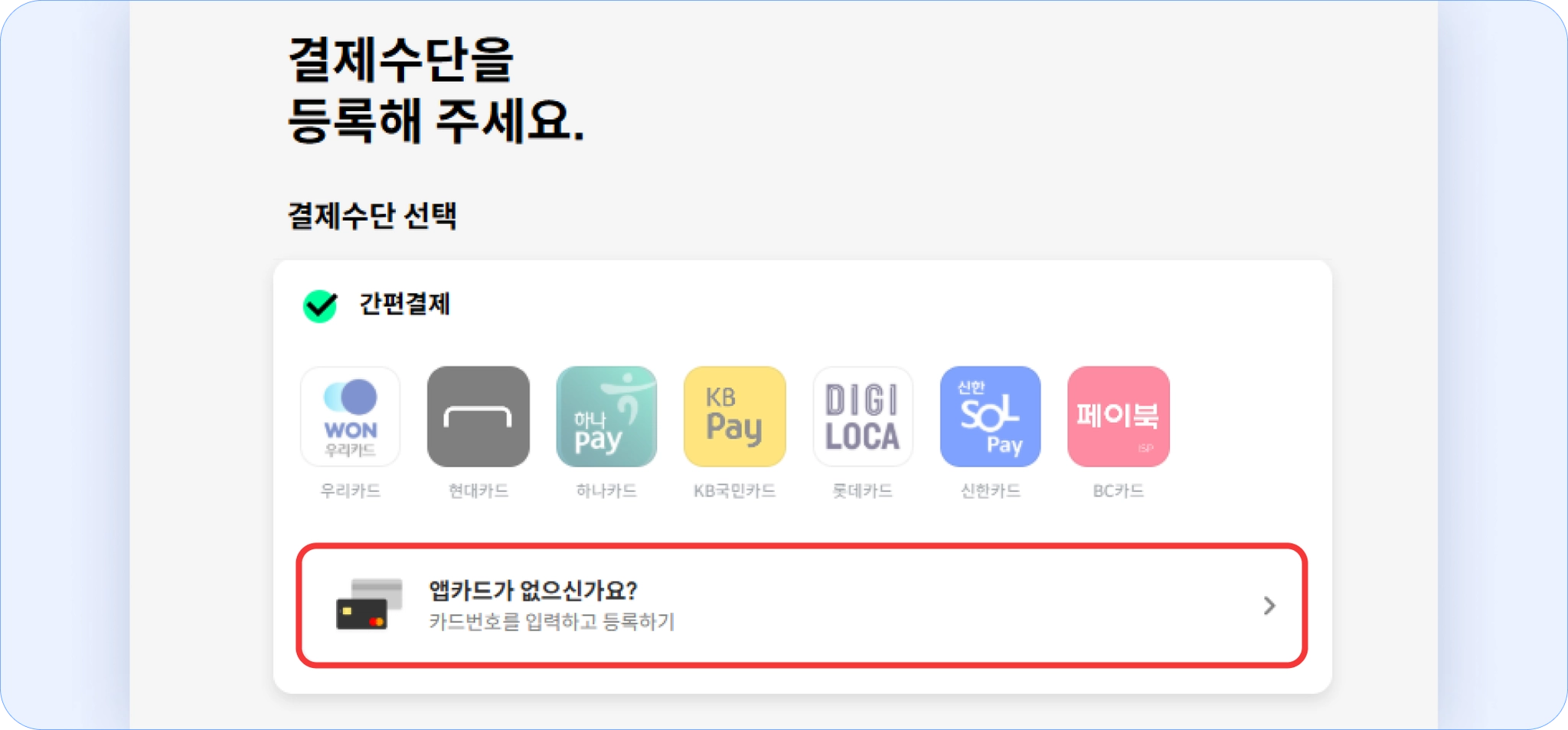 카드 등록 시, 꼭 앱카드가 없으신가요? 버튼을 클릭해 주세요.