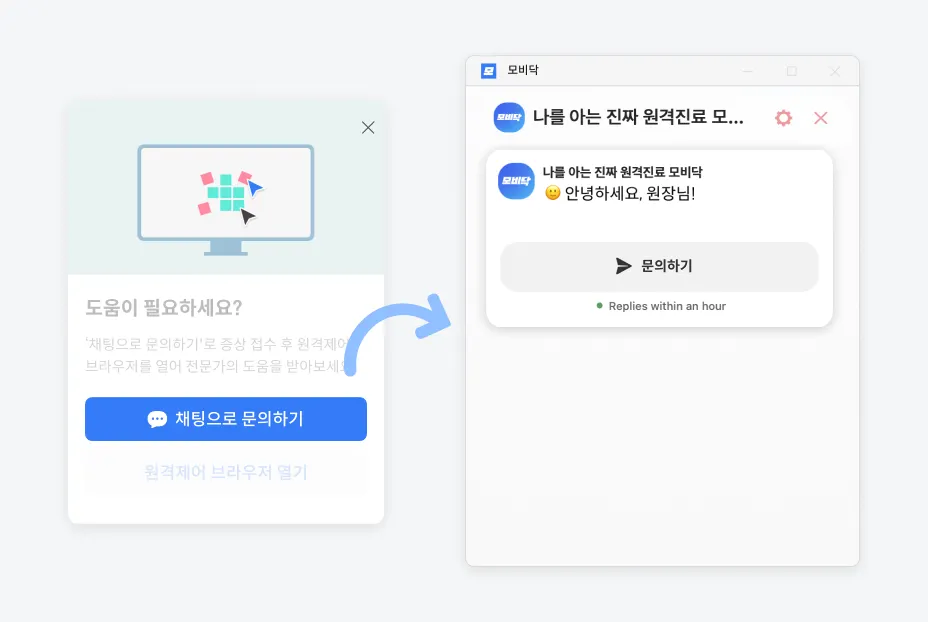 채널톡을 통해 채팅으로 모비닥 상담사와 대화를 주고받을 수 있습니다.