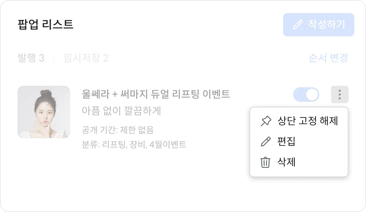 편집 : 해당 팝업의 내용 및 게시기간 등을 수정하는 기능입니다.