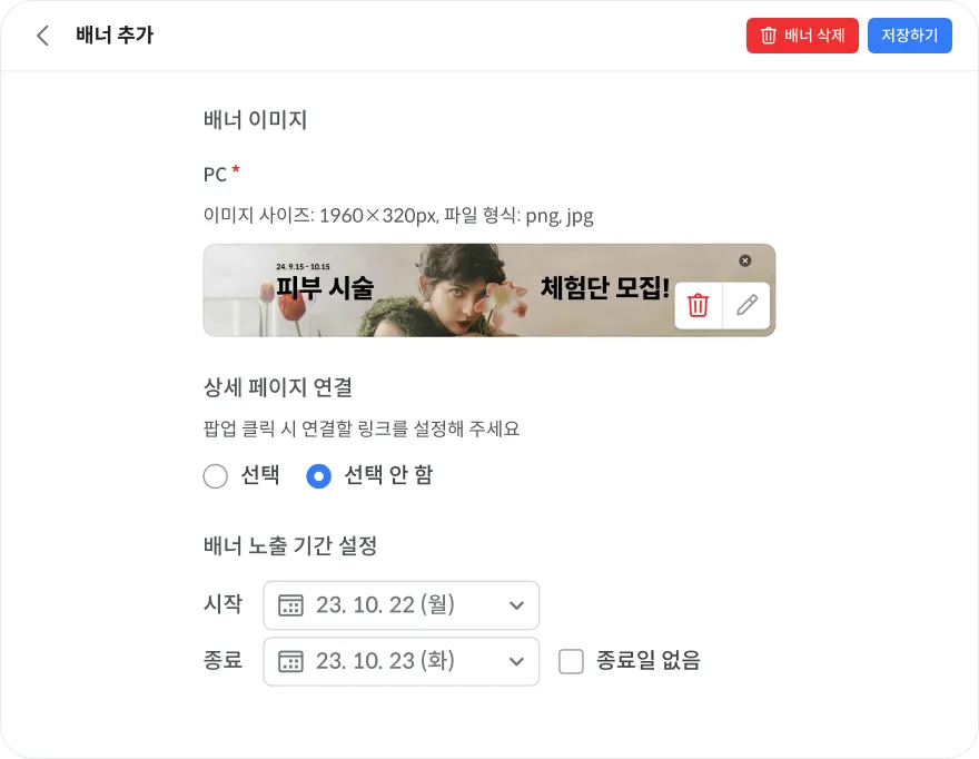 배너 노출 기간을 설정한 후 저장하기 버튼을 클릭합니다.