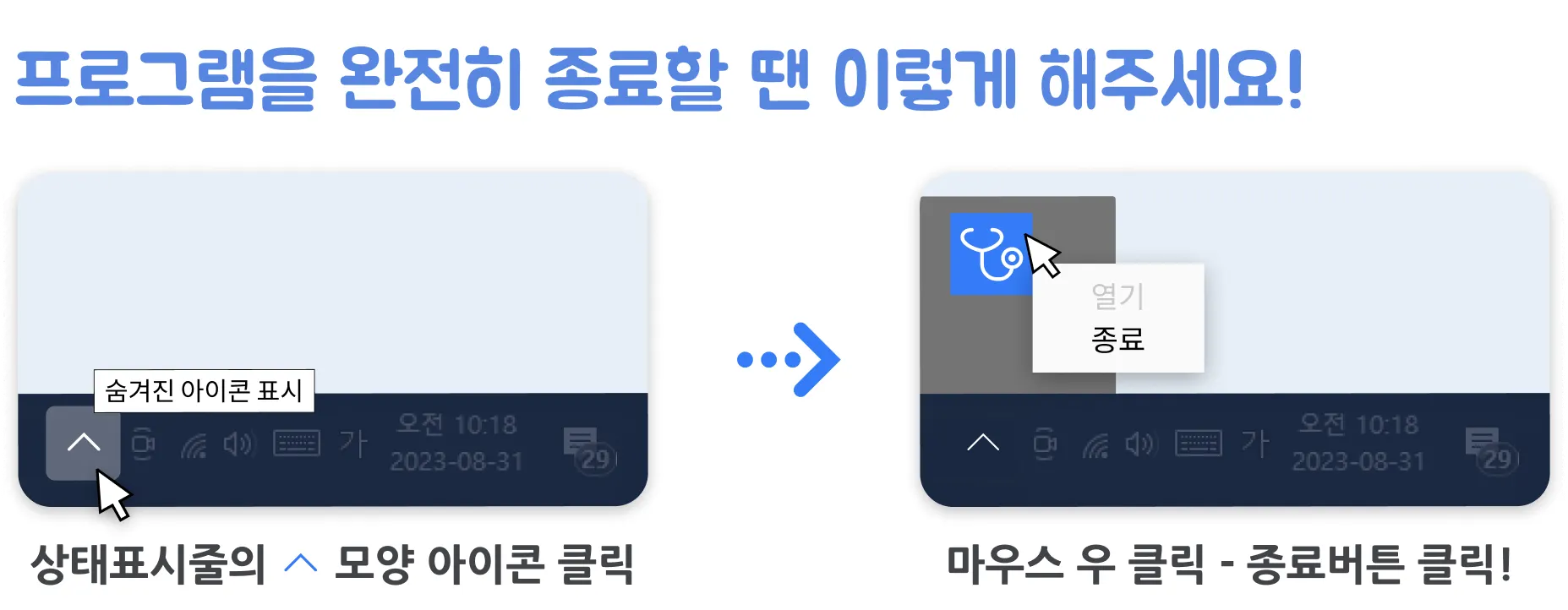 완전히 종료하기 위해서는 PC를 끄거나, 위 이미지처럼 트레이아이콘에서 종료를 해야해요.