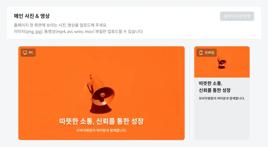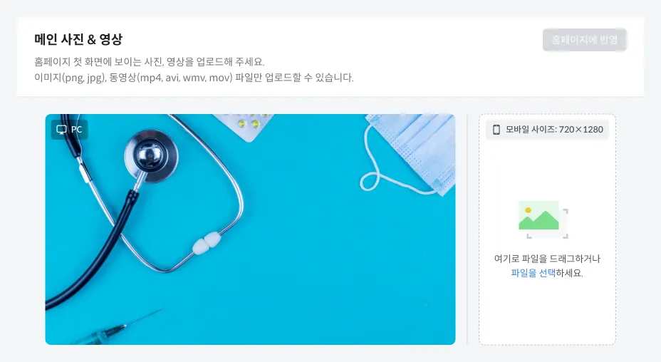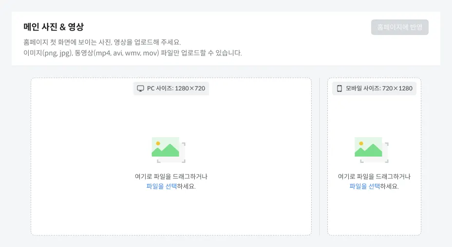 편집 후 반드 시 화면 우측 상단의 홈페이지 반영 버튼을 클릭해 주세요.