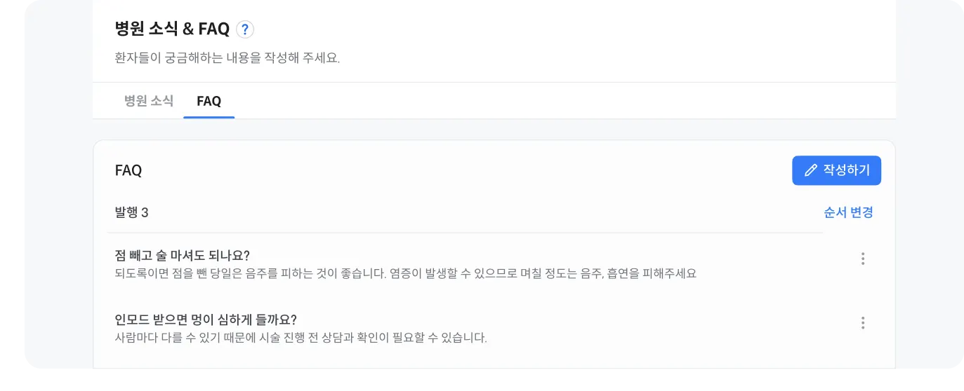 환자들이 자주 문의하는 질문을 간단하게 정리하여 올릴 수 있습니다.