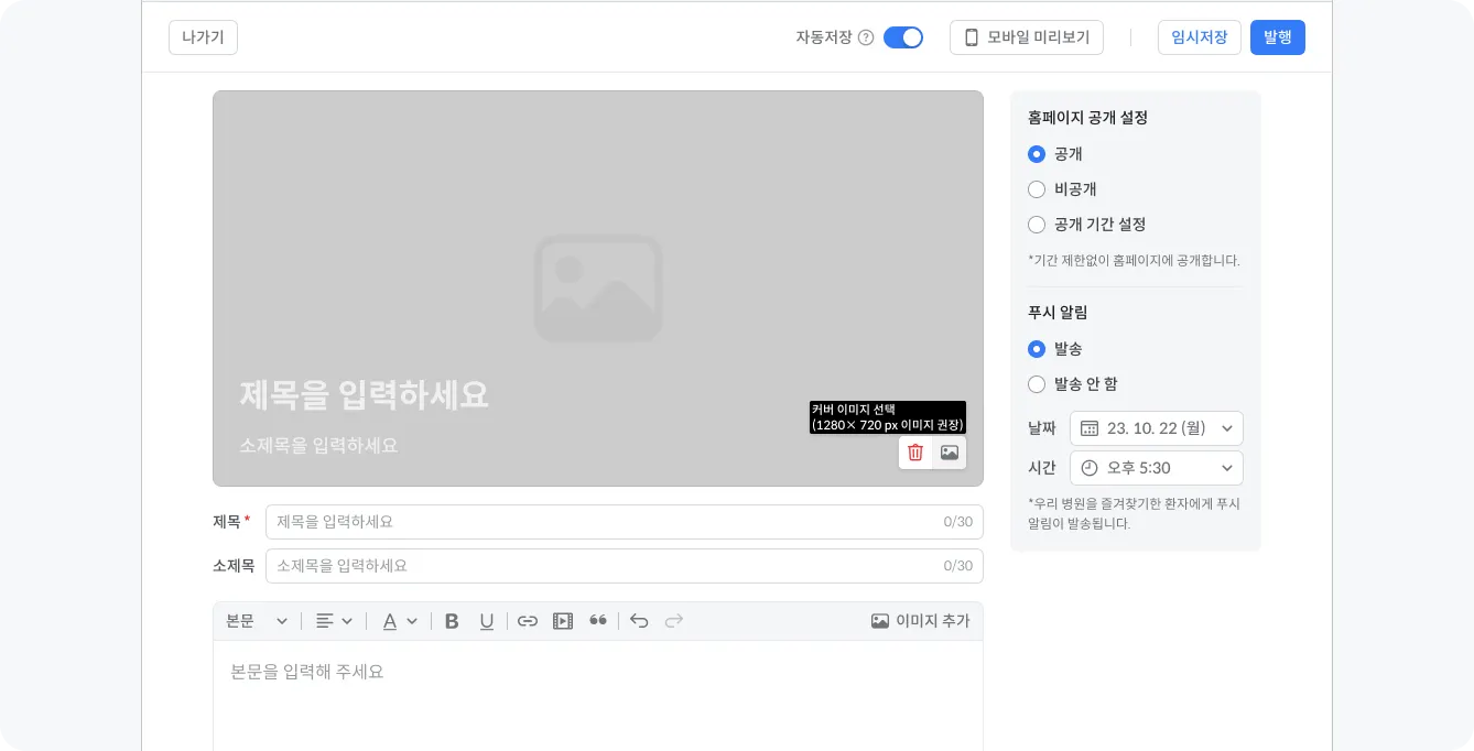 작성한 소식의 “공개 설정 여부”와 앱 “푸시 알림 발송 여부”를 선택합니다.